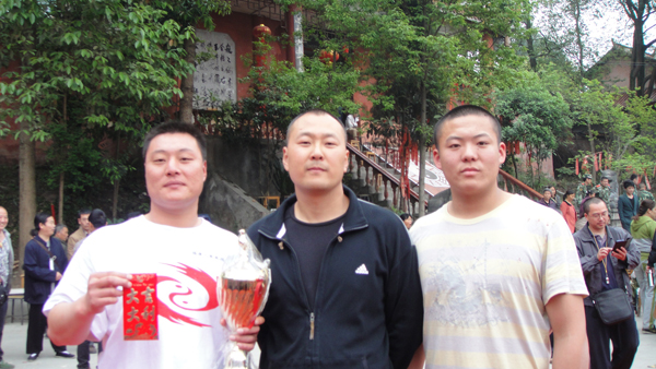 比赛分为两个时段,上午各派名流、代表武术表演;下午进行太极竞技推手比赛。作为陈氏太极的弟子,自然对推手比赛,充满了期待。在比赛中,大师兄张海涛(刘老师陈家沟弟子)的竞技推手最为出彩,俗话说行家一出手,知道有没有!他的太极拳推手的动作,有快有慢,而且蓄发明显,劲道十足!几乎把所有对手推翻转而倒,以绝对优势取得冠军!看到精彩场景时,心中不禁被陈氏太极强大的内劲所折服。年仅十八岁的二师兄刘健成上场也是此次比赛的又一大亮点,最终败给同门师兄屈居亚军。比赛最后陈式太极弟子以囊括冠亚军的优异成绩,给我们这次崇州之行画上了圆满的句号。